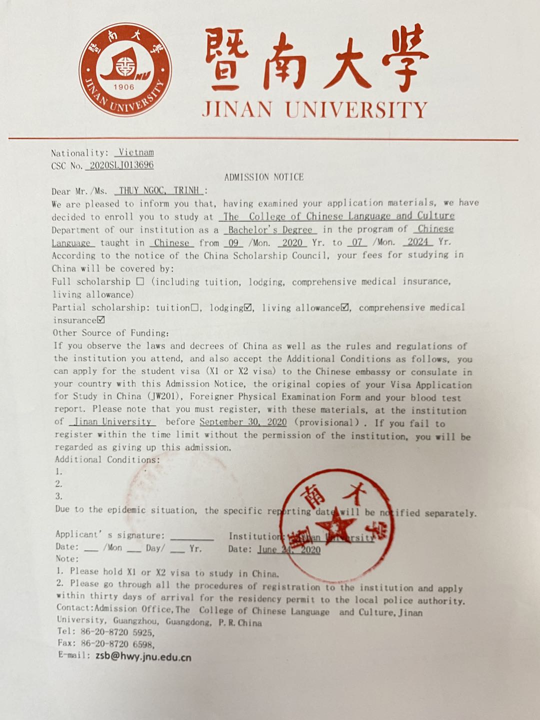 Chúc mừng bạn Thủy Ngọc nhận được giấy báo của Jinan University - ngôi trường danh tiếng của Trung Quốc.