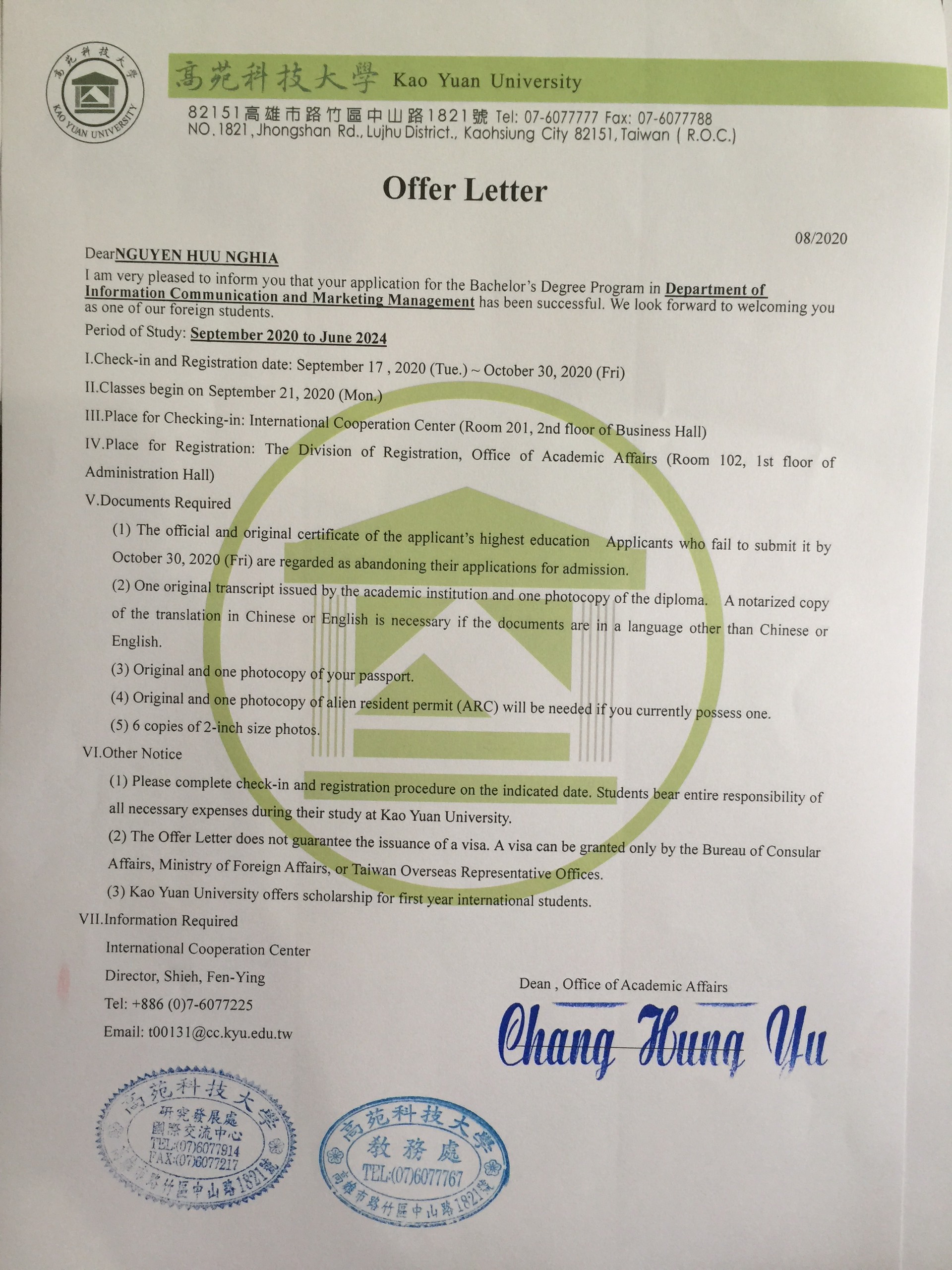 Chúc mừng bạn Nguyễn Hữu Nghĩa đã nhận được giấy báo học bổng đại học của trường Đại học Khoa học Kỹ thuật Cao Uyển Đài Loan