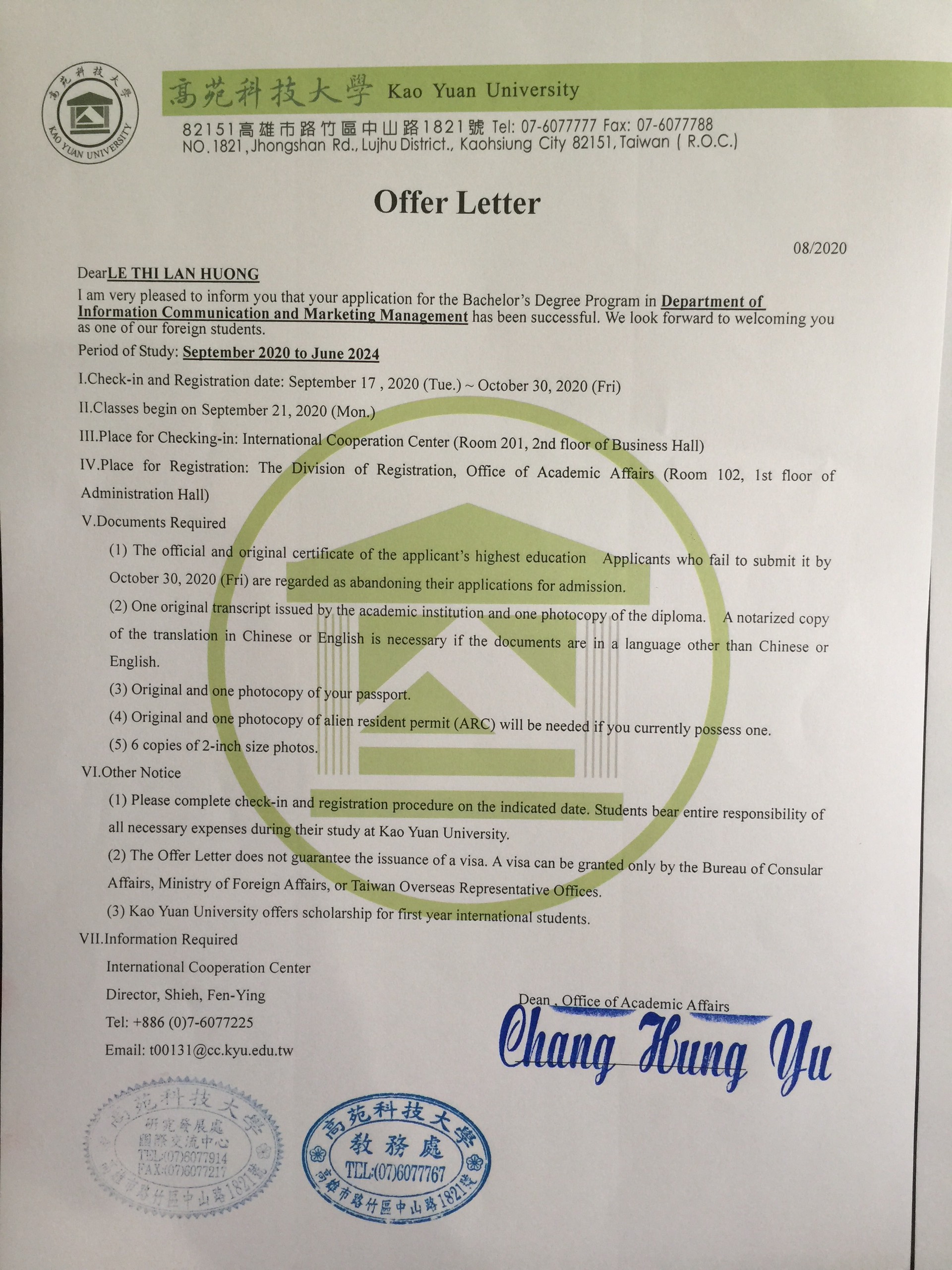 Chúc mừng bạn Lê Thị Lan Hương đã nhận được giấy báo học bổng đại học của trường Đại học Khoa học Kỹ thuật Cao Uyển Đài Loan