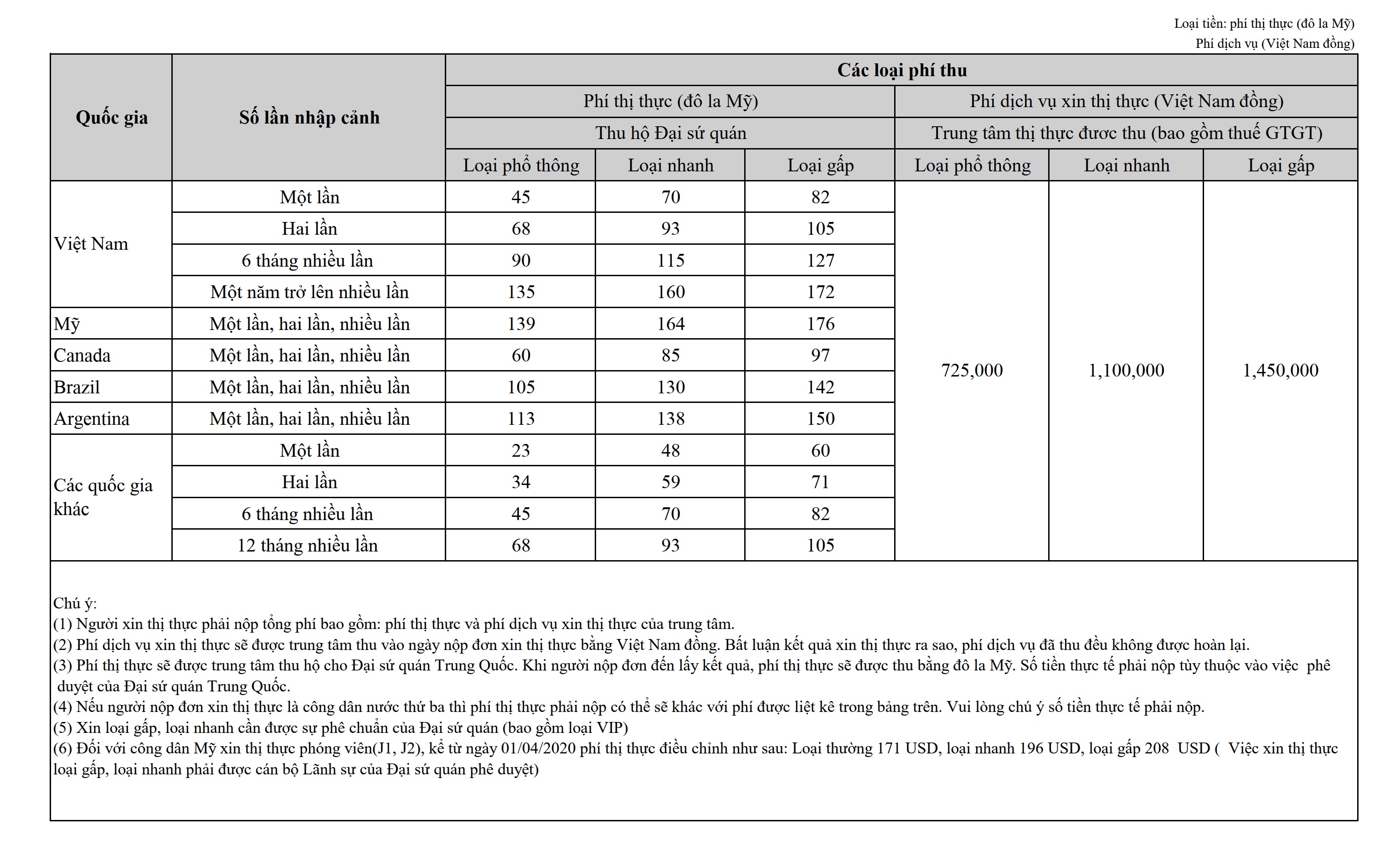 - Phí dịch vụ: 725.000 đồng, nộp cho trung tâm thị thực bằng VNĐ và không được hoàn lại dù kết quả Visa là trượt hay đỗ.