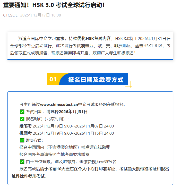 Nhằm đáp ứng nhu cầu học tiếng Trung quốc tế và tiếp tục tối ưu nội dung kỳ thi HSK, HSK 3.0 sẽ bắt đầu triển khai thi thử tại một số điểm thi trên toàn cầu vào ngày 31/01/2026. Đây sẽ là cơ hội cho người học tiếng Trung trải nghiệm cấu trúc đề thi mới, sát với nhu cầu học tập, du học và làm việc tại Trung Quốc.