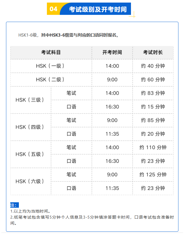 - Thời gian thi bao gồm 5 phút điền các thông tin cá nhân và 3-5 phút thời gian điền đáp án vào phiếu đáp án. Thời gian thi khẩu ngữ bao gồm cả thời gian chuẩn bị.