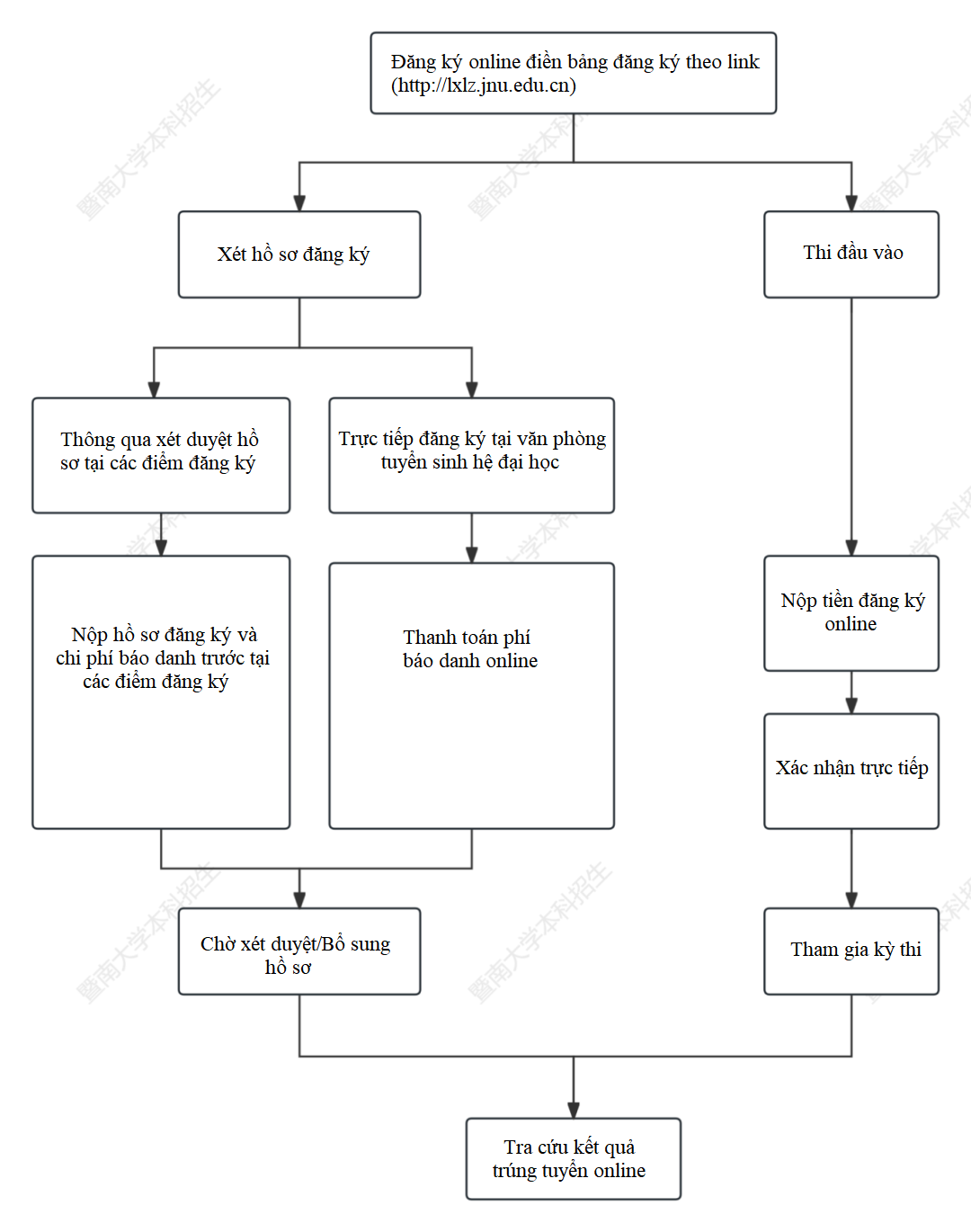 - Đăng ký phải được nộp đồng thời thông qua trang web của Trung tâm Giáo dục và Hợp tác Ngôn ngữ (http://www.chinese.cn) và trang web tuyển sinh đại học của Đại học Ký Nam.