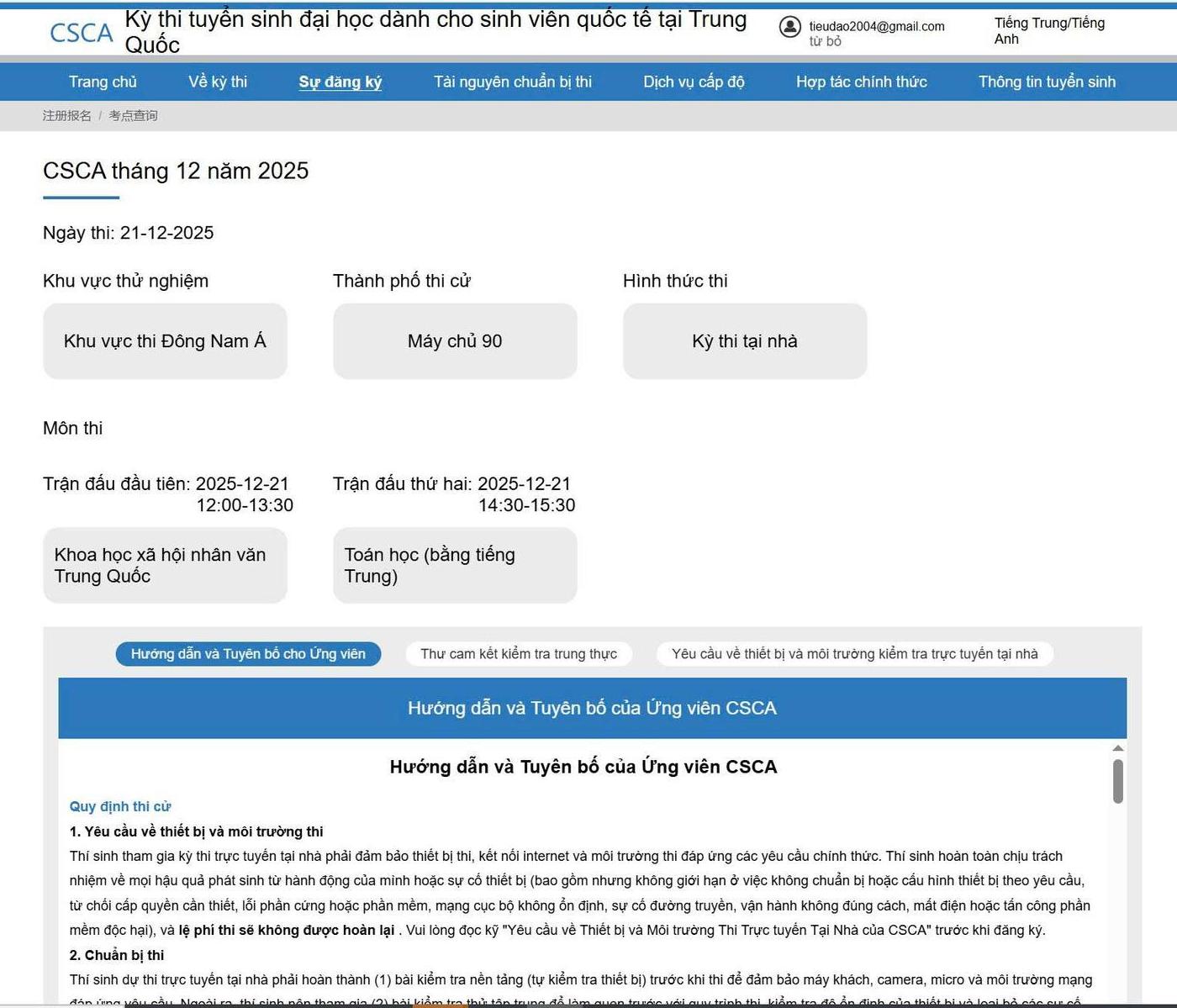 1. Cách đăng ký: Tạo tài khoản tại trang web www.csca.cn bằng địa chỉ email cá nhân có thể truy cập lâu dài, hoàn thành biểu mẫu đăng ký, chọn kỳ thi mong muốn và thanh toán lệ phí dự thi.